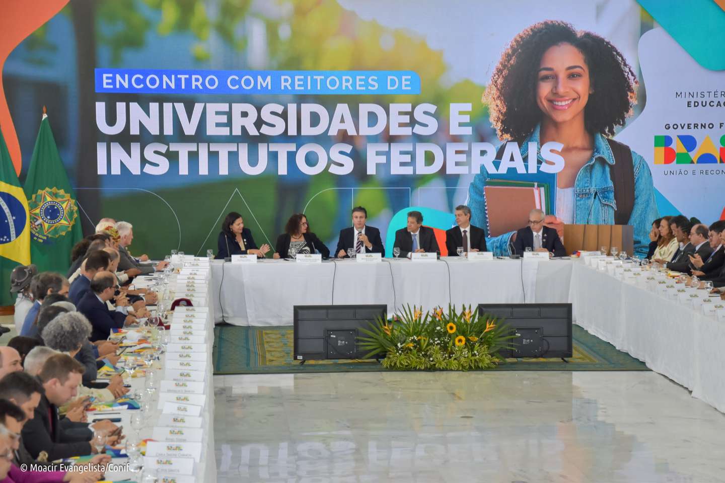 Acompanharam o momento a presidente do Conif e reitora do Colégio Pedro II, Ana Paula Giraux; os reitores dos Institutos Federais de Brasília (IFB), Veruska Machado; de Goiás (IFG), Oneida Cristina Irigon; e Goiano (IF Goiano), Elias Monteiro; o secretário de Educação Profissional e Tecnológica do Ministério da Educação (Setec/MEC), Marcelo Bregagnoli; a diretora de Programa (Setec/MEC), Luciana Massukado; e o diretor de Desenvolvimento da Rede Federal (Setec/MEC), Charles Okama; entre outras autoridades da área da Educação.